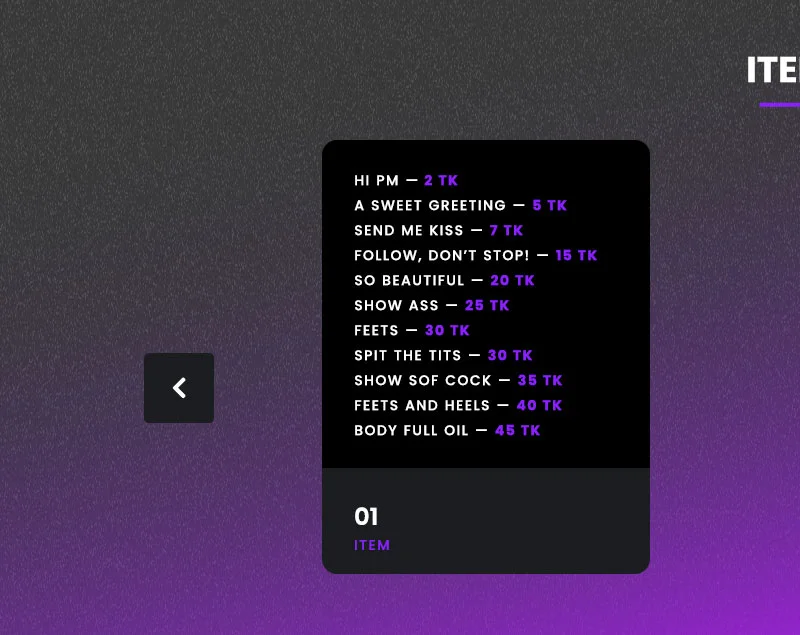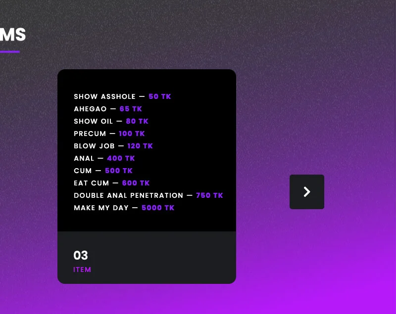 Ahegao, Tarian Erotis, Air mani, Doggy Style, Memukul, Tingkat Penis, Korset, Kulit, Dildo atau Vibrator, Fetish Kaki, Tenggorokan, Instruksi Masturbasi, Bermain Peran, Permainan sperma, Mainan Anal, cum extra, Dirty Talk, Meraba, Masturbasi, Handjob, Twerk, CEI, Pantat ke Mulut, Mandi, Striptis, Mainan Seks, Lateks, Blowjob, Pra-ejakulasi, SPH, Tittyfuck, Penghinaan, Cincin Penis, Merokok, Pijat, Tersedak, Orgasme, Stimulasi kaki, Hardcore, Pertunjukan Minyak, Heels, Cowgirl